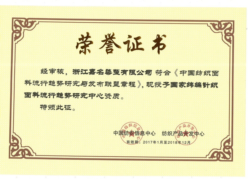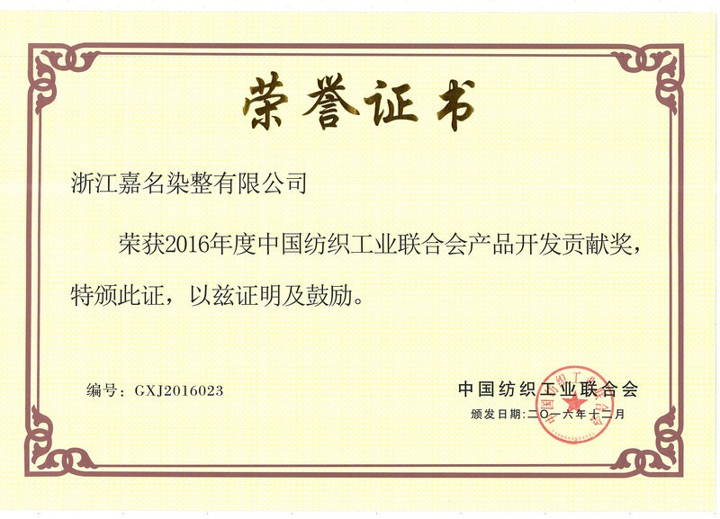 在中國紡織創(chuàng)新年會上,中國紡織工業(yè)聯(lián)合會授予“嘉名染整”“2016年度中國紡織工業(yè)聯(lián)合會產(chǎn)品開發(fā)貢獻(xiàn)獎”;中國紡織信息中心、紡織產(chǎn)品開發(fā)中心授予“嘉名染整”“國家緯編針織面料流行趨勢研究中心資質(zhì)”