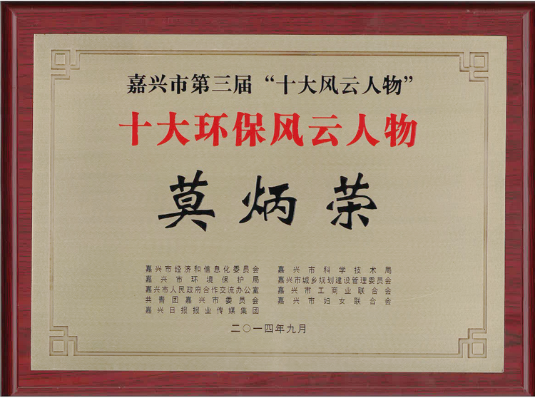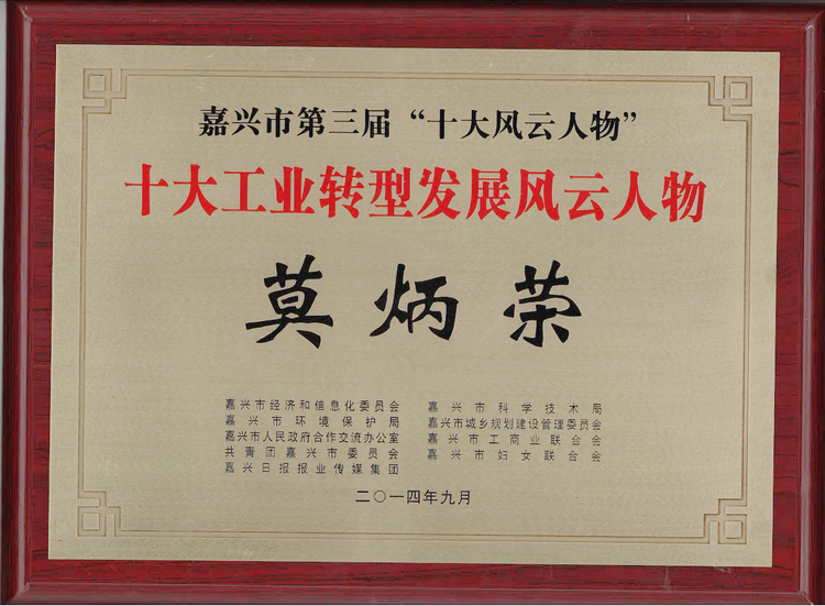 9月18日,在嘉興市第三屆“十大風云人物”頒獎典禮上,公司董事長兼總經理莫炳榮同時榮獲“嘉興市十大工業轉型發展風云人物”、“嘉興市十大環保風云人物”榮譽稱號。