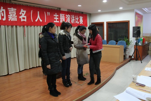 12月17日晚,公司工會、團支部聯(lián)合舉辦的 “我心中的嘉名(人)”主題演講比賽,12名選手參加了比賽。李丹華獲一等獎,范曉磊、張金金獲二等獎,宋建會、陳華芳、楊  麗獲三等獎,陸松芬、謝建甫、衛(wèi)建秋、鐘曉蘭、黃孝軍、陳慧琴獲鼓勵獎。鳳鳴街道黨委委員吳霞萍,公司總經(jīng)理莫炳榮為獲獎選手頒獎。